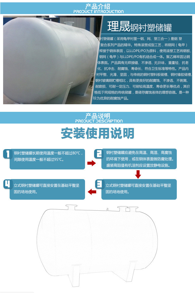 5、全塑PE儲罐長期使用高溫一般不超過60℃,間隙使用一般不超過80℃,鋼襯PE儲罐長時間使用高溫一般不超過80℃,鋼襯PO儲罐一般不超過95℃。